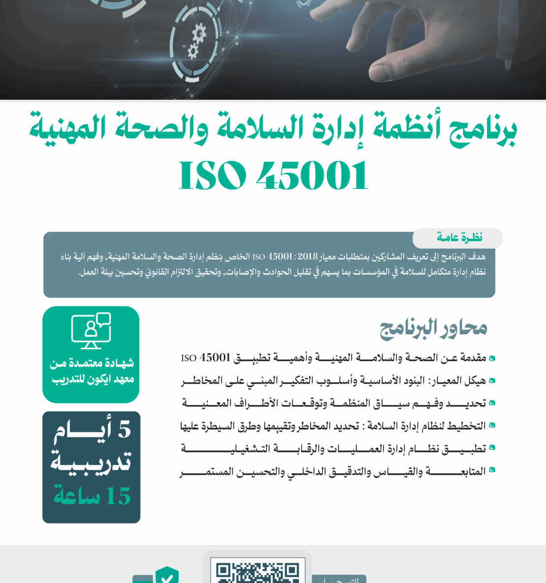 هدف البرنامج إلى تعريف المشاركين بمتطلبات معيار ISO 45001:2018 الخاص بنظم إدارة الصحة والسلامة المهنية،